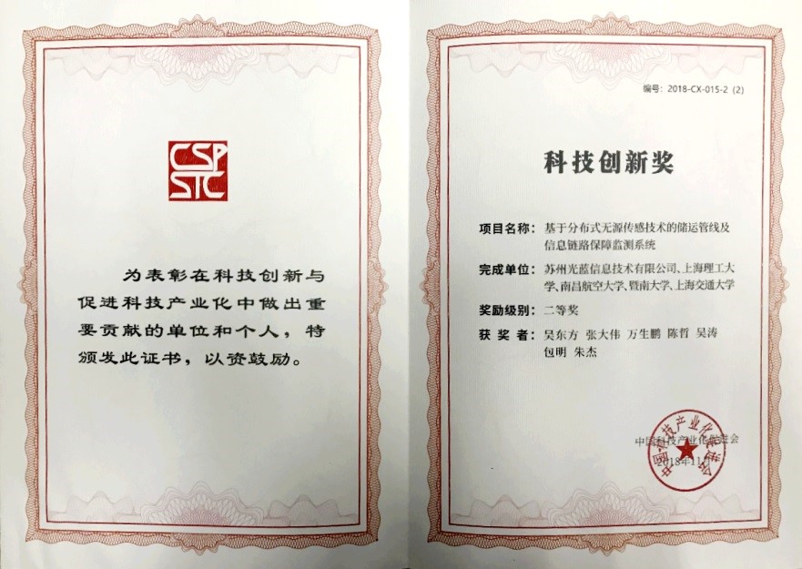 “2018中国科技产业化促进会创新影响力论坛暨科学技术奖颁奖仪式”于2018年11月28日在北京西苑宾馆隆重举行,来自科技部、工信部、国资委等相关部委领导、知名专家学者、获奖代表、科技企业家及有关人士近400人出席了会议。由上海理工大学光学仪器与系统教育部工程中心主任张大伟教授与苏州光蓝信息技术有限公司等多家单位联合完成的《基于分布式无源传感技术的储运管线及信息链路保障监测系统》技术成果获科技创新奖二等奖。