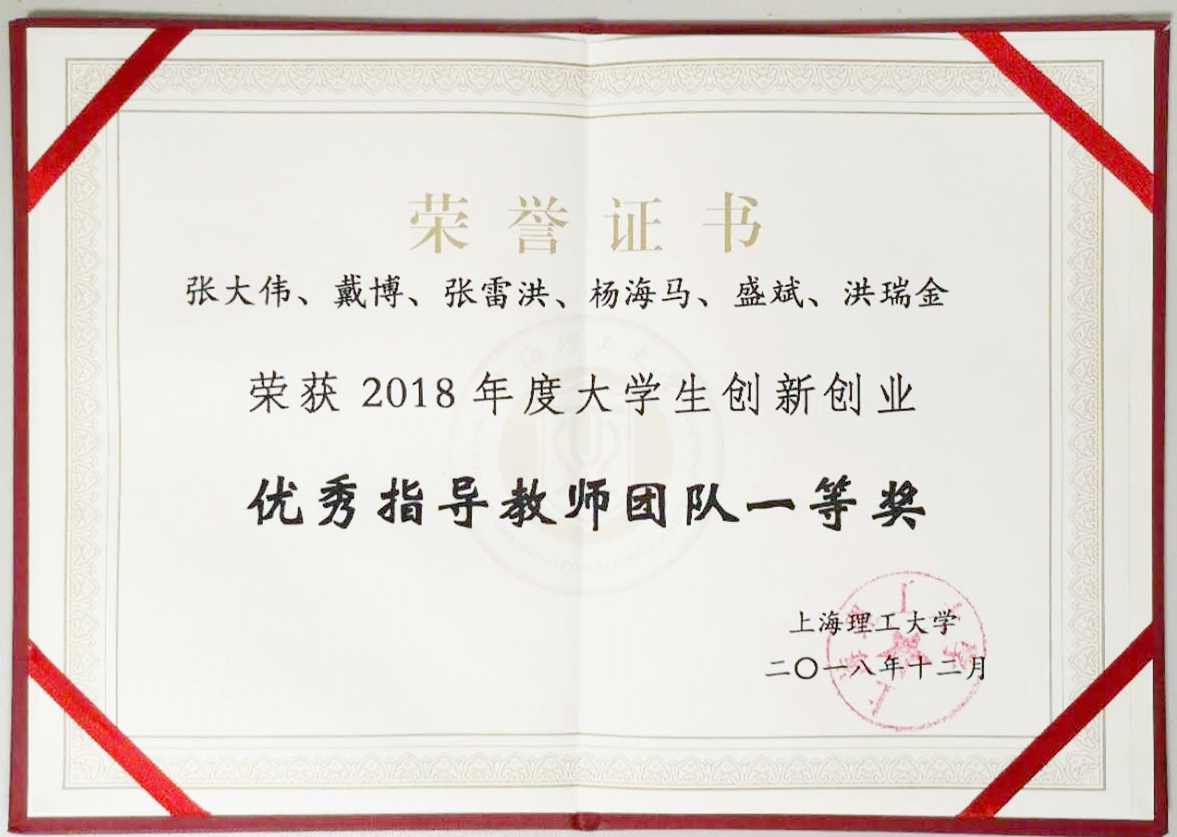 2018年,上海理工大学的师生在国家级和省部级的各项学科竞赛、创新创业活动中取得了可喜的成绩,为学校赢得了荣誉。为表彰指导老师为学校学生创新创业人才培养工作所做出的贡献,学校于2018年12月10日公布了2018年度大学生创新创业优秀指导教师团队和个人获奖名单的通知。张大伟带领课题组荣获2018年度大学生创新创业优秀指导教师团队(研究生)一等奖。