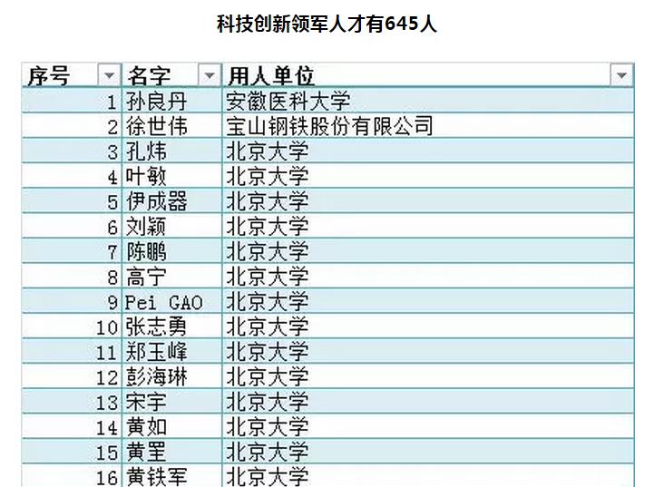 此次公布的名单中,共有科技创新领军人才有645人,科技创业领军人才397人,教学名师103人,第四批国家“万人计划”青年拔尖人才入选名单及经费支持意见(自然科学210人,哲学社会科学、文化艺术类64人)。