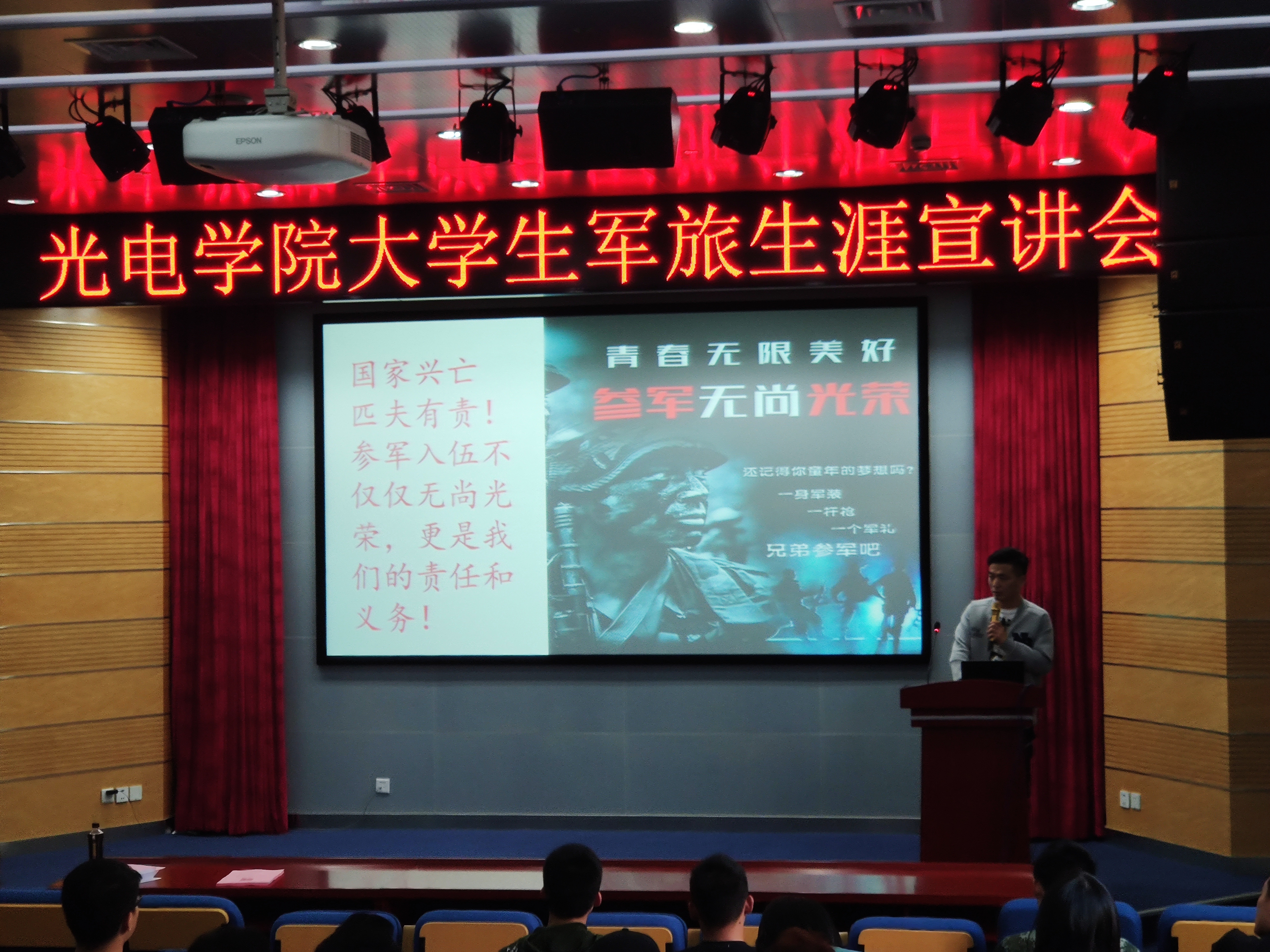 4月19日下午,“热血青春 报国有方”退伍大学生军旅生涯宣讲会在光电楼报告厅举行。amjs澳金沙门欢迎您党委副书记曹英,司广文、王萌、刘新、周航四名退伍大学生,各年级学生代表共同参加此次活动。本年度amjs澳金沙门欢迎您征兵宣传工作也就此拉开帷幕。