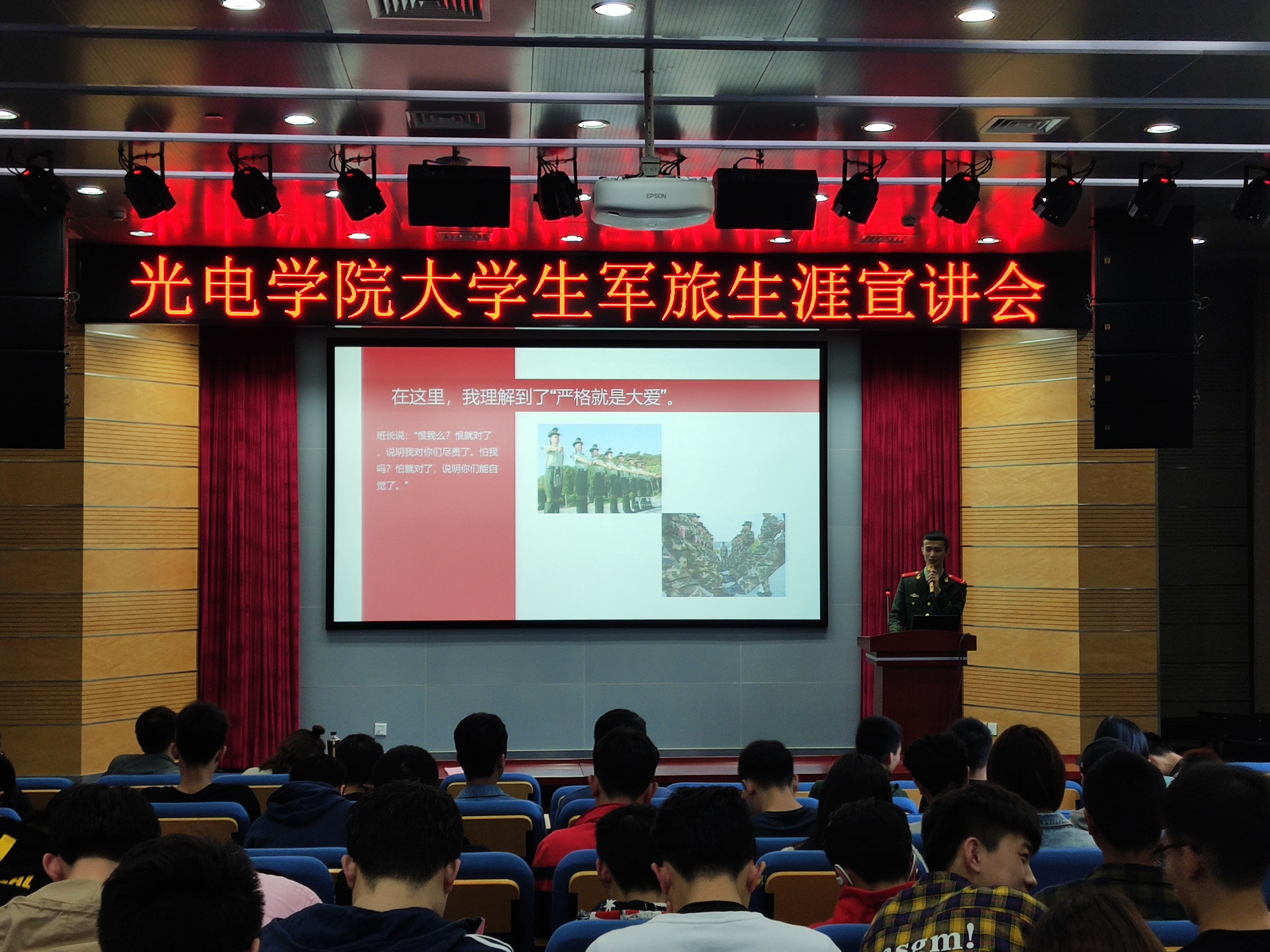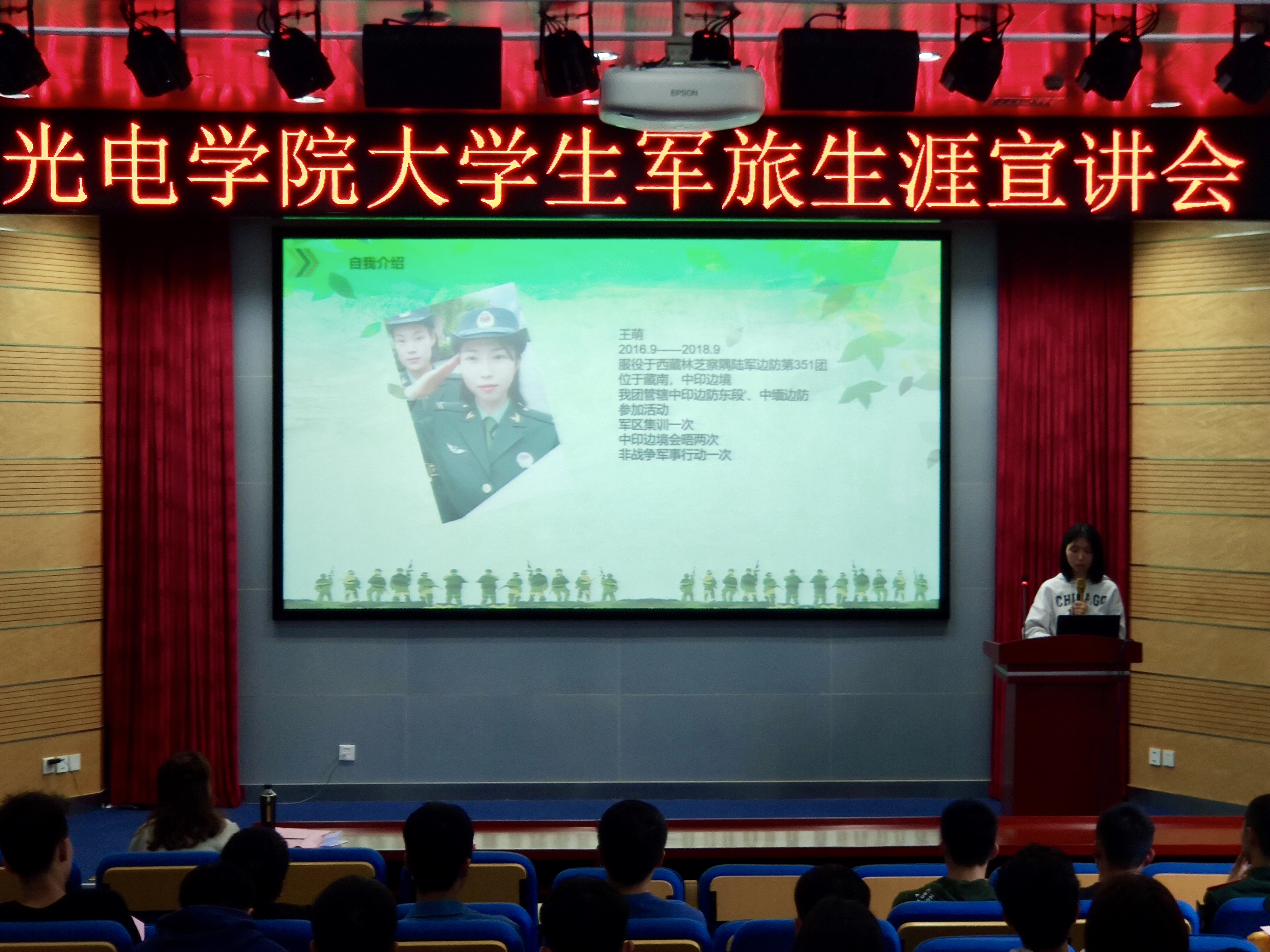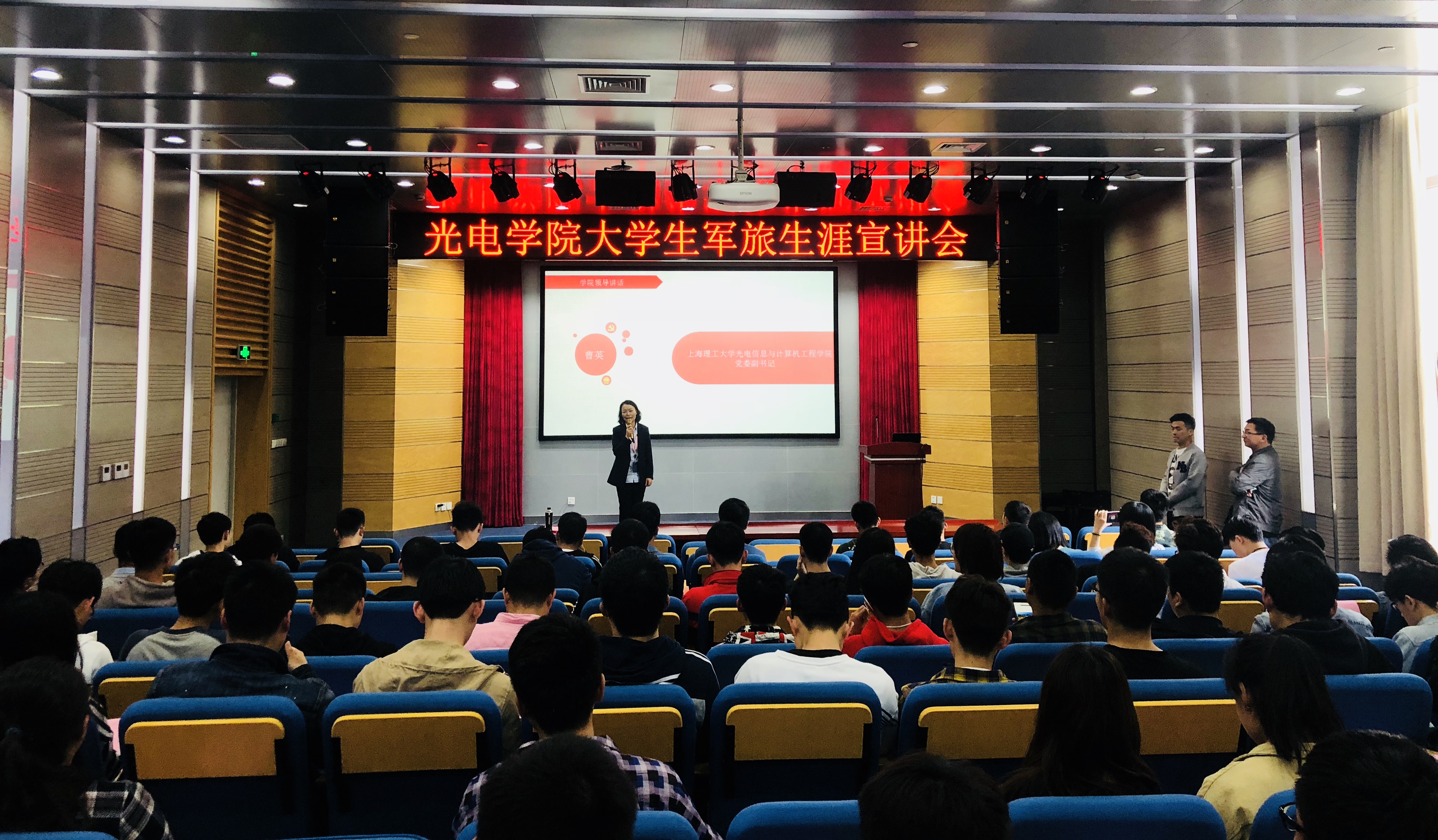 宣讲会伊始,曹英副书记希望同学们能够通过此次宣讲会了解国家征兵政策,多一种人生的选择,理解和尊重选择参军入伍的同学,并衷心感谢四位退伍大学生来分享他们的军旅生涯。