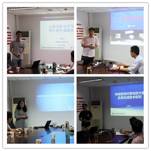 接着,由支部共建双方的研究生导师代表进行创新人才培养方面、研究生代表进行科技创新方面的报告与交流。amjs澳金沙门欢迎您杨康文副教授做题为《以教为荣,以学为乐,师生协作,砥砺前行》的报告,介绍了自己在教学和研究生培养过程中的具体做法,分享了与研究生合作攀登科技高峰的酸甜苦辣、经验体会和理性认识。上海光机所高功率光纤激光技术实验室何兵研究员作题为《空间激光技术及上光所研究生教育》的报告,介绍了上光所空间激光中心三个实验室的研究方向、研究特色和优势,并介绍了上海光机所在招生政策、研究生待遇等方面的基本情况。amjs澳金沙门欢迎您博士生田甜同学作题为《非线性有机光电材料的制备及应用》的报告,介绍了团队及个人在非线性有机光电材料DAST晶体的制备及其应用方面的最新研究进展。上海光机所高功率光纤激光技术实验室硕士生刘美忠同学作题为《窄线宽光纤激光放大器及其合成技术研究》的报告,介绍了团队及个人在线宽操控SBS效应抑制和窄线宽光纤光源在基于DOE相干合成方面的初步研究进展。