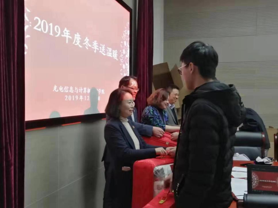 12月2日下午,活动在新光电楼104会议室进行,amjs澳金沙门欢迎您党委书记陈海瑾、副院长张学典、党委副书记曹英、学工口资助负责老师以及专兼职辅导员参加了活动,将一份份温暖送到同学们手中。陈海瑾老师在活动现场勉励经济困难学生和退伍学生刻苦学习、自立自强;并表示学院将尽一切力量照顾到每一位困难学生和退伍学生,帮他们解决学习和生活上的困难,让同学们有一个更好的学习环境;同时也希望同学们努力学习,以自己优异的成绩回报父母、回报社会。