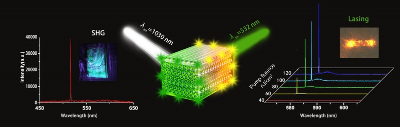 有机非线性光学晶体DAST(4-[4-(dimethylamino) styryl]-1- methyl-pyridinium toslate)具有比传统无机非线性晶体如铌酸锂(LiNbO3)等高1-2个数量级的二阶非线性,在太赫兹波激发/探测,通讯领域的超高速电光调制以及激光波长转换等诸多应用领域引起了广泛关注。但长期以来掣肘于DAST晶体光损伤阈值低下,其发展与应用受到了很大的制约。为突破以上瓶颈,研究团队利用具有桶装结构的环糊精(β-CD)分子对条状的DAST分子进行包覆,形成DAST@β-CD超分子体系,利用β-CD分子的位阻效应成功地抑制了DAST分子的光分解。而且,超分子包覆可以有效消除浓度消光效应对DAST光致发光性能的负面影响,荧光量子效率可提高约10倍。在此基础之上,通过二次培养法成功制备出高质量的DAST@β-CD超分子晶体纳米线(NWs)、微晶(MPs)和混晶(CMCs)。研究表明这些DAST@β-CD超分子晶体不仅具备与原DAST晶体相当的二阶非线性,而且兼顾了优良的荧光特性与光稳定性。利用此特点,课题组在DAST@β-CD微晶上实现了低阈值单模激光信号的输出,在混晶上实现了随机激光信号输出。在敞开空气环境下, 532 nm皮秒激光以~17.5 GW / cm2的峰值功率密度(该值比DAST晶体光漂白阈值高8-9个数量级)连续照射晶体4小时,仍然能维持95%的激光信号强度,显示了极高的光稳定性。