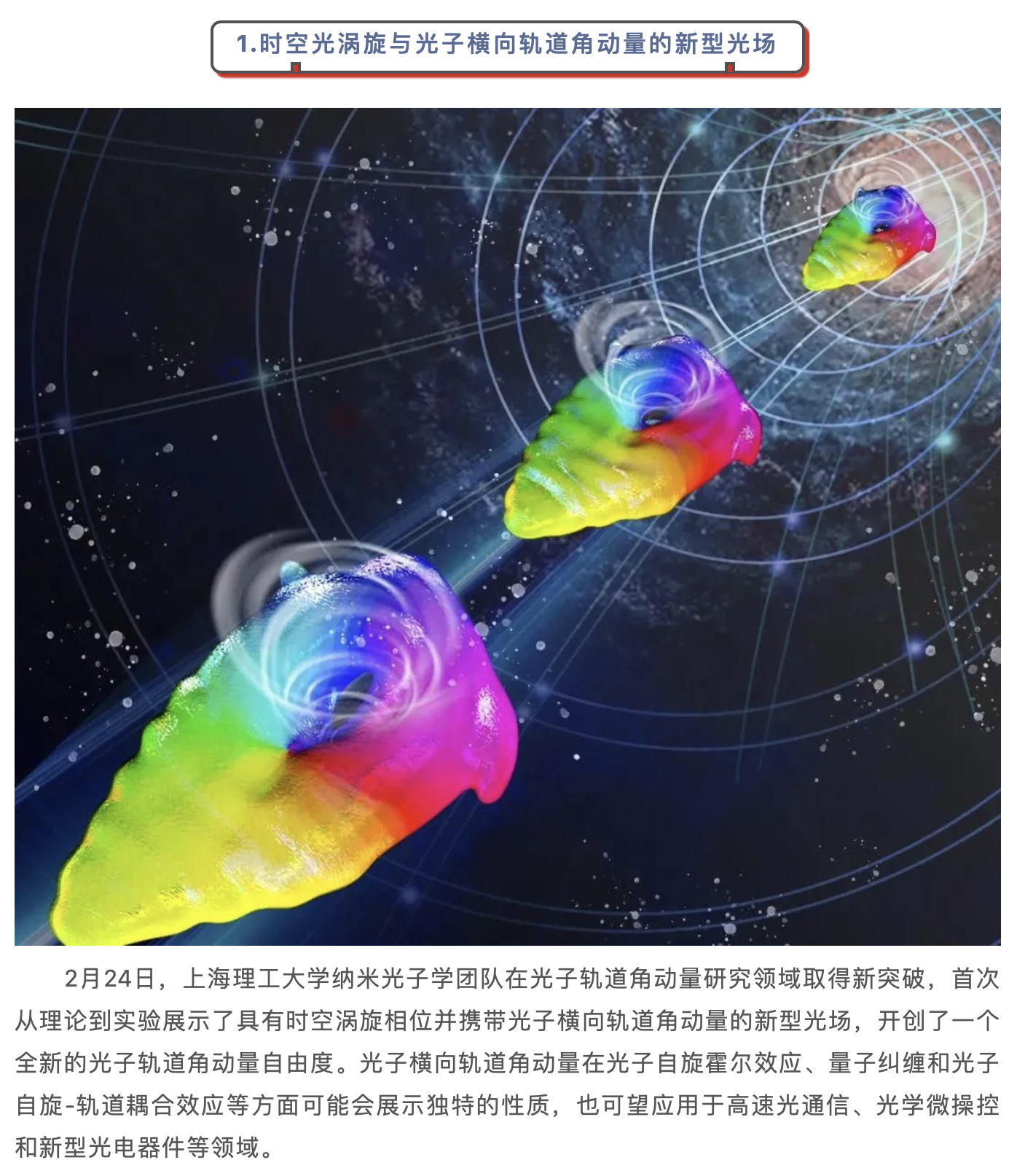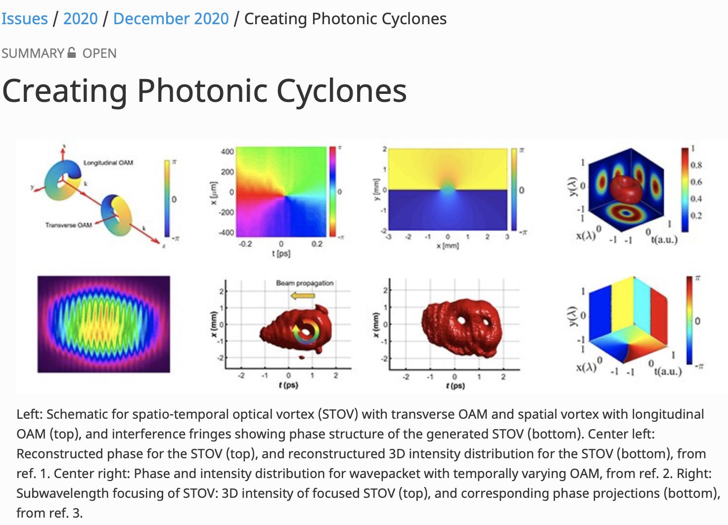 上海理工大学庄松林院士、顾敏院士领导的未来光学实验室在光子轨道角动量研究领域在2020年里取得国际瞩目的成绩。詹其文教授带领的纳米光子学团队在世界光学顶尖期刊《自然-光子学》上发表文章首次从理论到实验展示了具有时空涡旋相位并携带光子横向轨道角动量的新型光场,开创了一个全新的光子轨道角动量自由度(https://www.nature.com/articles/s41566-020-0587-z)。团队在此基础上迅速开展了系列工作,成功实现对光子轨道角动量在时间域上的超高速调制,并找到在亚波长空间尺度上聚焦生成高度局域化的横向光子轨道角动量的有效途径,为进一步研究这一新型光子态与物质的相互作用打下基础。这一系列研究成果入围美国光学学会(OSA)评选的全球30项2020年度光学重大进展(https://www.osa-opn.org/home/articles/volume_31/december_2020/features/optics_in_2020/)。