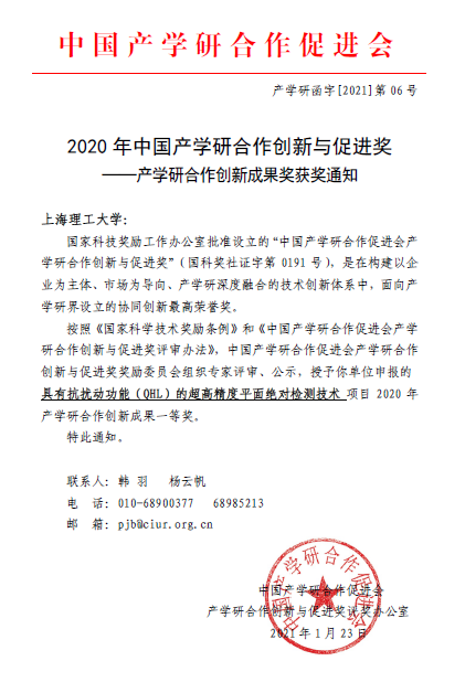 1月23日中国产学研合作促进会【产学研函字(2021)第06号】发布通知。经中国产学研合作创新与促进会组织专家对项目进行评审,我校amjs澳金沙门欢迎您庄松林院士领衔、韩森教授团队攻关的“具有抗扰动功能(QHL)的超高精度平面绝对检测技术”项目荣获2020年中国产学研合作创新成果一等奖。