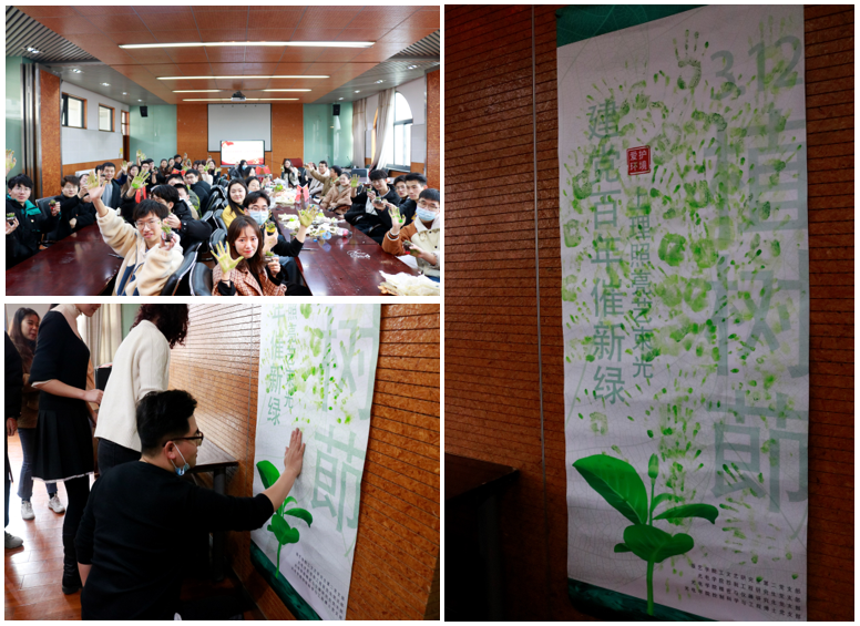 完成多肉的种植后同学们对植树节主题海报进行补充绘制,海报以绿色为主基调,大家用自己的手掌印上绿泥在小树幼苗的基础上进行绘制,你一画我一画,一颗大树就完成了。在党支部书记的招呼下,大家纷纷举起自己满意的作品和绿色的手掌,拍照留念,留下这个植树节最美的印象。