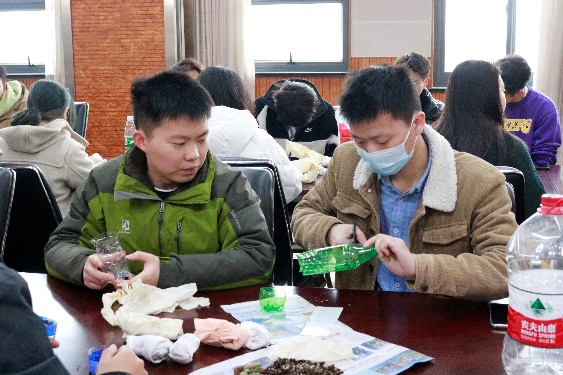 大家将自己准备好的空瓶和使用过的纸杯二次利用,设计自己的花盆样式使用剪刀进行裁剪,精心挑选喜爱的多肉植物,相互协作填土、将多肉仔细地种植到自己设计的器皿当中,形成自己独有的创意盆栽,活动现场一片温馨欢乐的气氛。播下一粒种子,洒下一片希望。栽下一棵小苗,孕育一段成长。伴随着欢声笑语,一盆盆玲珑有致的多肉植物景观完工,同学们捧着自己动手栽培的多肉植物景观,主动拍照发送到微信群供大家欣赏,每个人脸上都露出了满意的笑容。