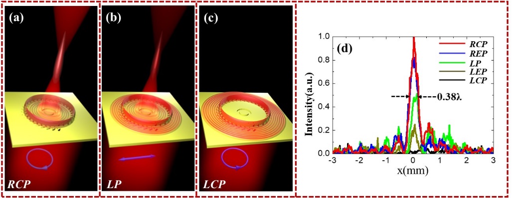 我们将超表面波前调控原理推广应用至太赫兹近场突破衍射极限的超聚焦光斑调控,通过设计手性依赖的超表面结构并结合相干效应将聚焦的等离基元发射至自由空间,形成单频点偏振可控且突破衍射极限的太赫兹超聚焦光斑(FWHM~0.38λ) (如图4所示);相关研究结果有望应用至太赫兹超分辨成像。
