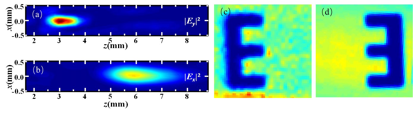 如图1(a)为x-偏振入射的太赫兹波入射至所设计的超表面透镜的数值仿真;可以明显的发现,此时出射场中只有沿着y-轴方向偏振的聚焦光斑。同样,从图1(b)的实验可以看出—一束沿着x-偏振入射的太赫兹波入射至我们所设计的超表面透镜,聚焦光斑的偏振态沿着y-轴的方向,同样证明了我们所设计的超表面透镜同时拥有聚焦和偏振调控的功能。如图1(c, d)所示,被测的偏振依赖的样品,在前一个焦点处所成的像为”E”,而后一个焦点处所成的像为””,实现了偏振依赖的高分辨成像检测功能。