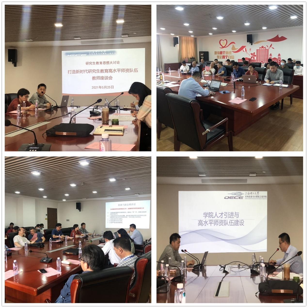 5月25日下午,amjs澳金沙门欢迎您举行了以“打造新时代高水平研究生教育师资队伍”为主题的研究生教育思想大讨论教师座谈会。学校研究生院副院长王张琦、学院党政班子、各系主任、学科带头人和教师代表40多人参加。会议由副院长彭敦陆主持。