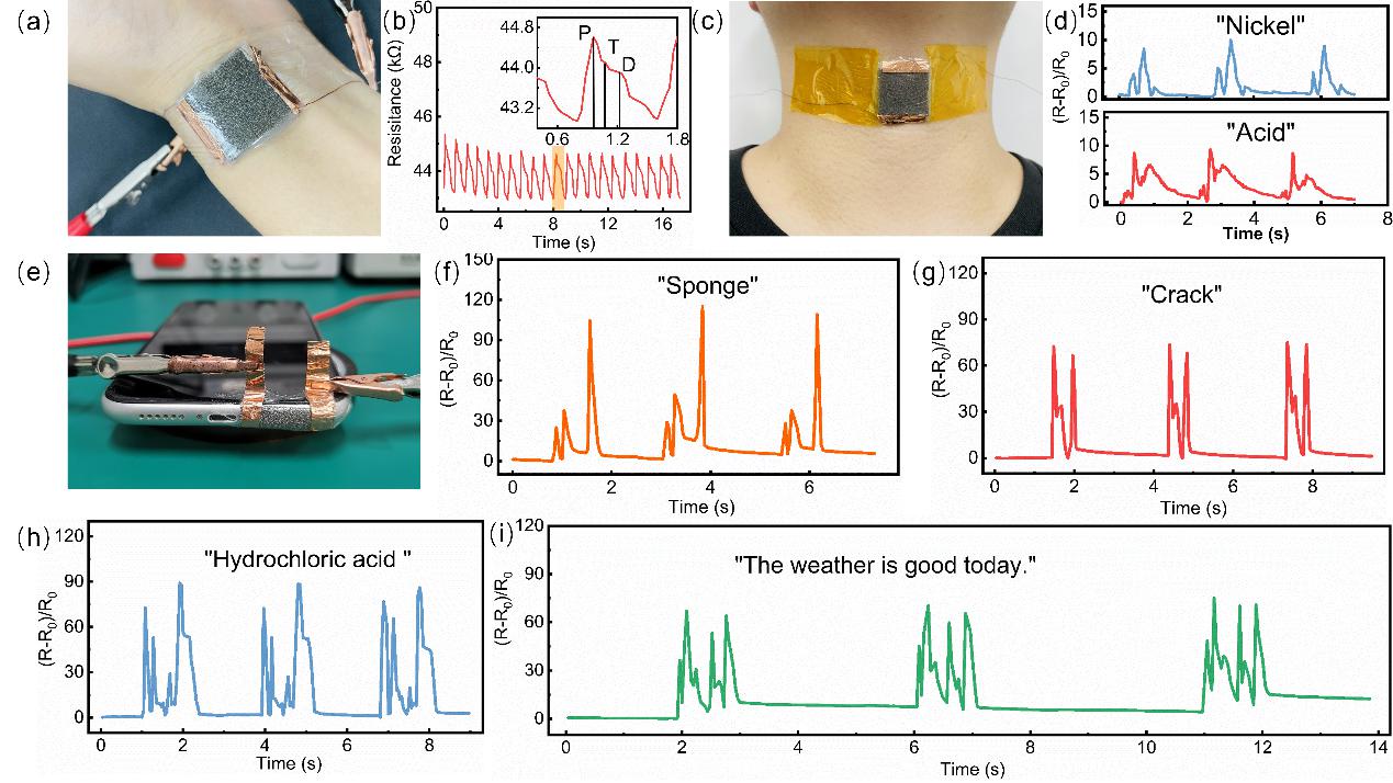 该柔性传感器在宽工作范围内具有高灵敏度以及超低检测极限,可以对包括脉搏、呼吸、出汗等不同生理信号进行实时监测(图二),并可应用于智能开关、电子皮肤等智能设备。传感器更高的灵敏度可以实现对生理信号更高的监测精度,发现更小的信号波动从而可以对信号进行更精细的判断和匹配,进一步的提升可穿戴传感器的监测准确性。同时,该多功能柔性传感器经过组合和处理后可以进一步提高传感器集成度、降低制作成本,有助于实时监测人体健康状况,具备广阔的应用潜力。
