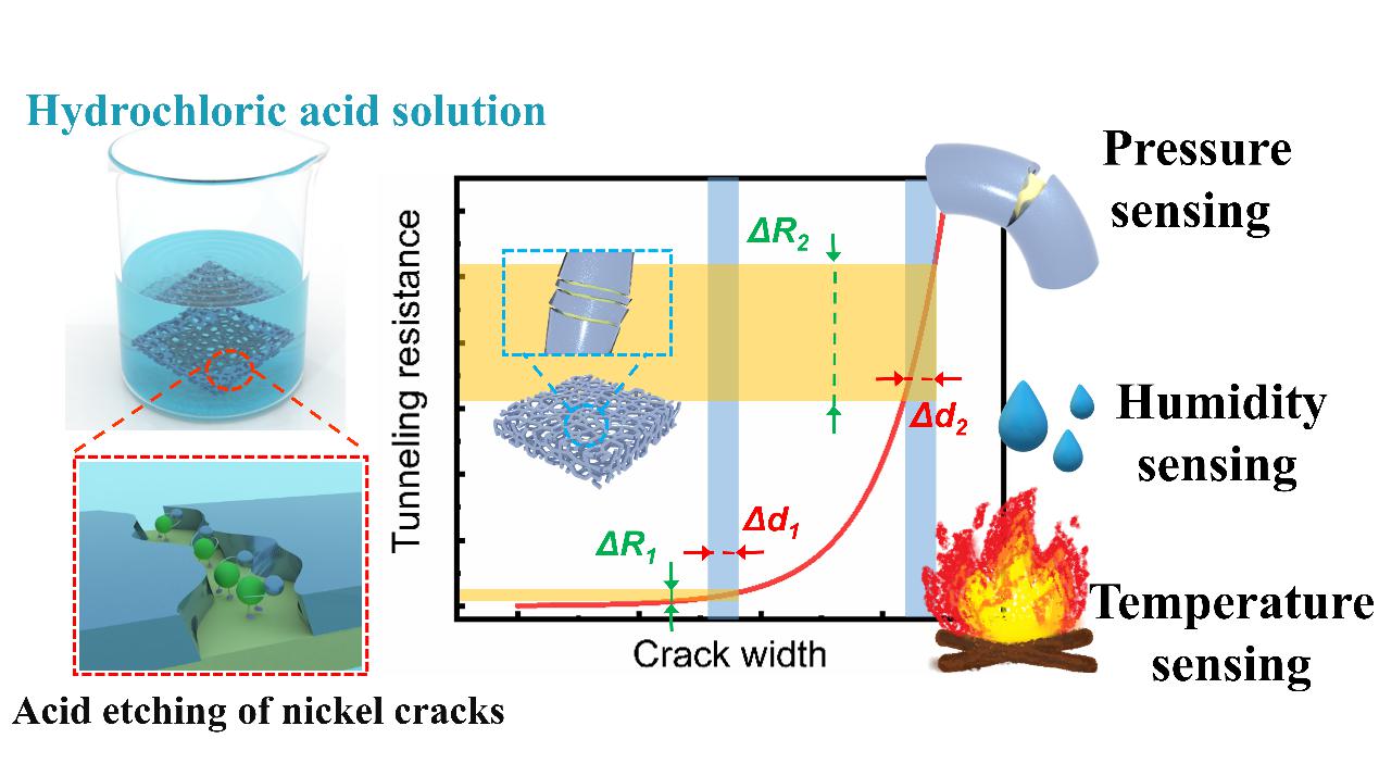 该研究提出了一种简单酸蚀扩展三维导电海绵纳米裂纹宽度的新方法,可显著提高传感器压力、湿度和温度传感的灵敏度。研究者首先在柔性聚氨酯海绵上采用离子溅射法制备镍导电海绵样品,然后进行机械压缩和酸蚀,从而进一步提高传感灵敏度,并指明了传感器宏观电阻变化与平均纳米裂缝宽度变化之比(ΔR/Δd)以及隧道初始裂缝宽度近似成指数关系的工作规律(图一)。柔性传感器对压力、湿度及温度等参数均表现高敏感性,其压阻灵敏度为257.5 kPa-1,提升幅度是未酸蚀样品的3000倍以上;同样,简单的酸蚀作用可以使湿度和温度灵敏度分别提高46000倍(69.96 kΩ/1%RH)和41(TCR=1.770 C-1)。