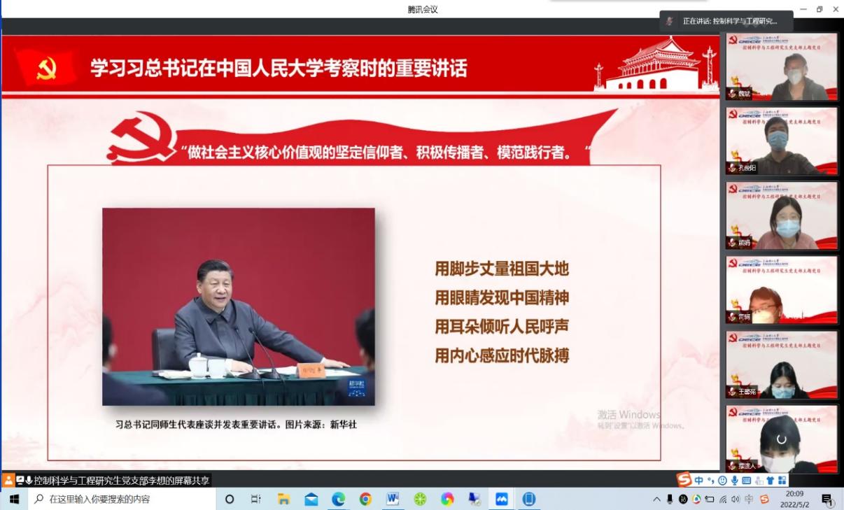 为了迎接即将到来的五四青年节,学院20多个师生党支部围绕深入贯彻学习习近平总书记考察中国人民大学重要讲话精神,开展了各具特色的主题党日活动,进一步坚定理想信念,筑牢信仰之基,引导支部和党员用实际行动诠释“一个支部就是一座堡垒、一名党员就是一面旗帜”。5月2日晚,amjs澳金沙门欢迎您党委书记袁媛、党委委员宋燕与控制科学与工程研究生党支部党员共同开展“守住防疫成果,勇担青年使命”主题党日。宋燕分享了在社区参与抗疫的感悟和居家科研的方法,她指出,作为一名青年党员,要弘扬五四精神,拼搏、创新、进取,既要积极投身抗疫一线,也要牢记学生职责,学习科研不能丢。袁媛向同学们提前致以节日的问候,对支部学生党员积极服从学校疫情防控规定,奋勇争先参与志愿服务的辛苦付出表示肯定与感谢,并强调,当前处于疫情防控攻坚阶段,同学们不能放松警惕,要做好时间管理和心理调适,与学校共同完成疫情大考;要谨遵总书记的殷切教诲,在青春的赛道上跑出当代青年的最好成绩。