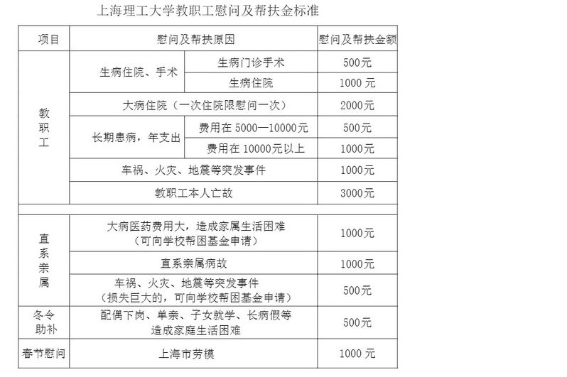 2、教职工现金慰问及帮扶金额按上述“上海理工大学教职工慰问及帮扶金标准”执行。