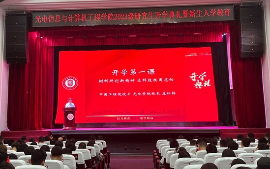 伴随着庄严的国歌声,典礼正式拉开帷幕。首先,庄松林院士以“树科研创新精神,立科技报国志向”为题为同学们讲授开学第一课。他通过讲述自身的科研奋斗经历向全体研究生新生提出了将个人梦融入中国梦的倡议。他谈到,当代青年应响应国家和时代召唤,勇于承担时代责任,秉持坚定的信念和正确的人生价值观,立志为国家富强、社会进步和人民幸福而努力读书、奉献自我。他勉励光电学子要潜心求学、砥砺奋进,脚踏实地、心比天高,坚持耕耘、成就梦想。