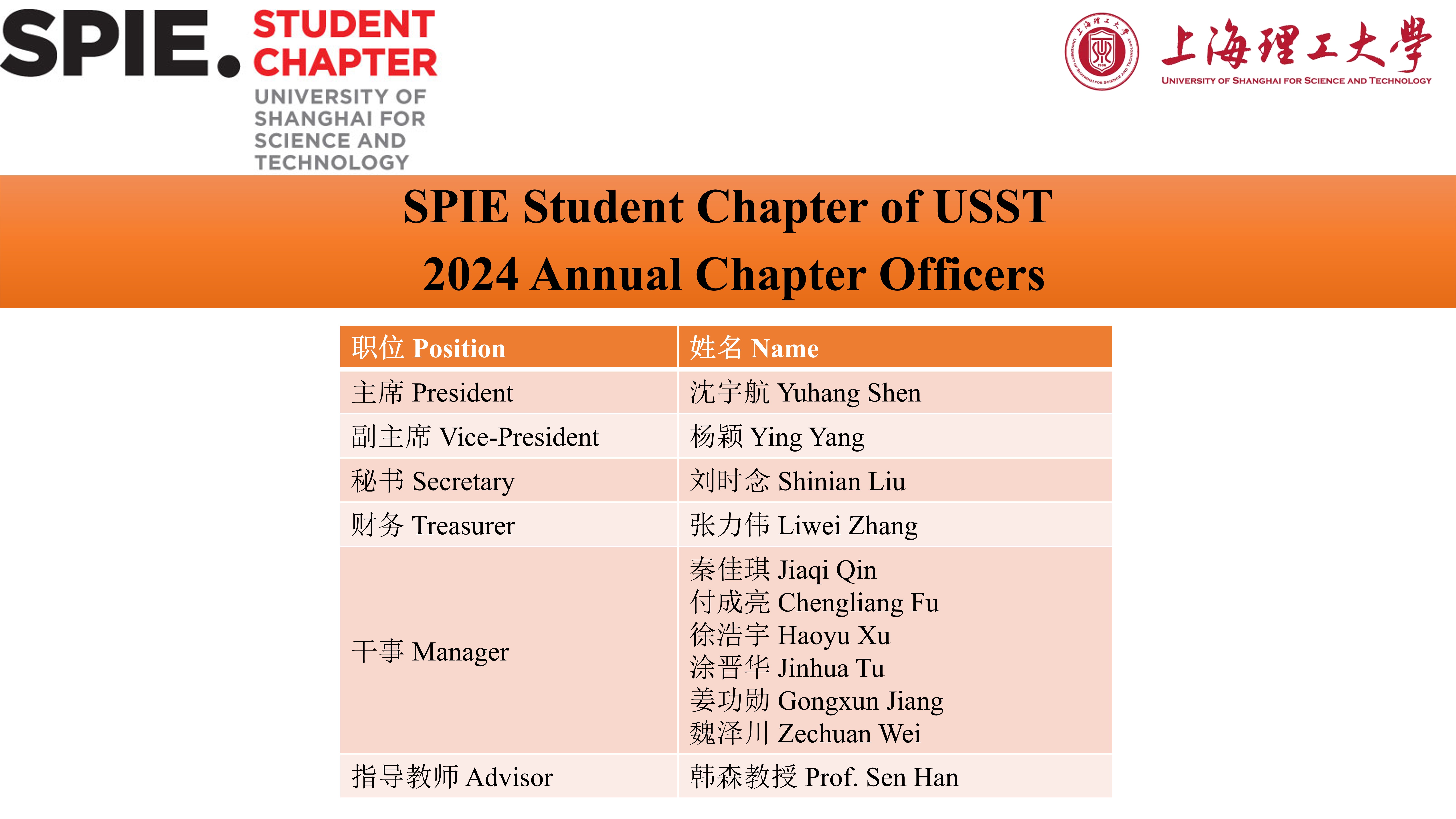 国际光学工程学会上海理工大学学生分会(SPIE Student Chapter of USST) 是上海理工大学韩森教授于2014年10月发起成立,致力于建设学生与国际接轨的学术交流平台,成员由上海理工大学光学工程及相关专业的博士、硕士及本科生组成,现任主席为博士研究生沈宇航同学。