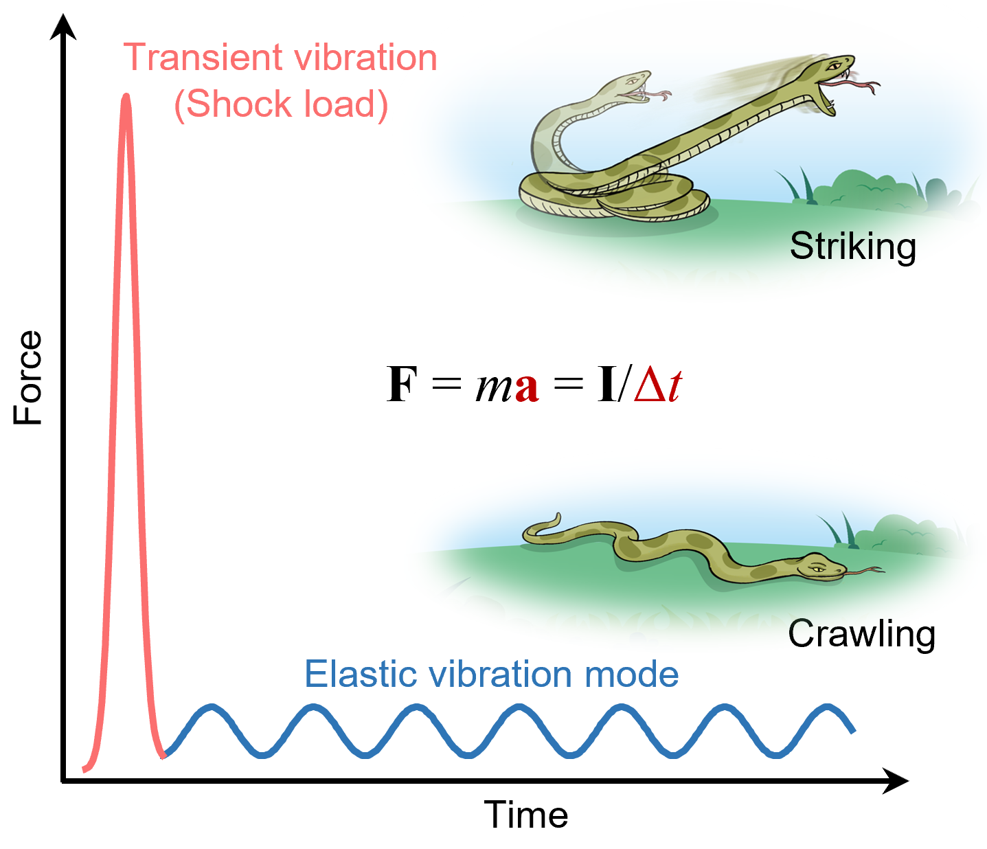 图2 冲量-动量定理原理图。插图展示了蛇类猛扑和一般爬行的视觉对比。