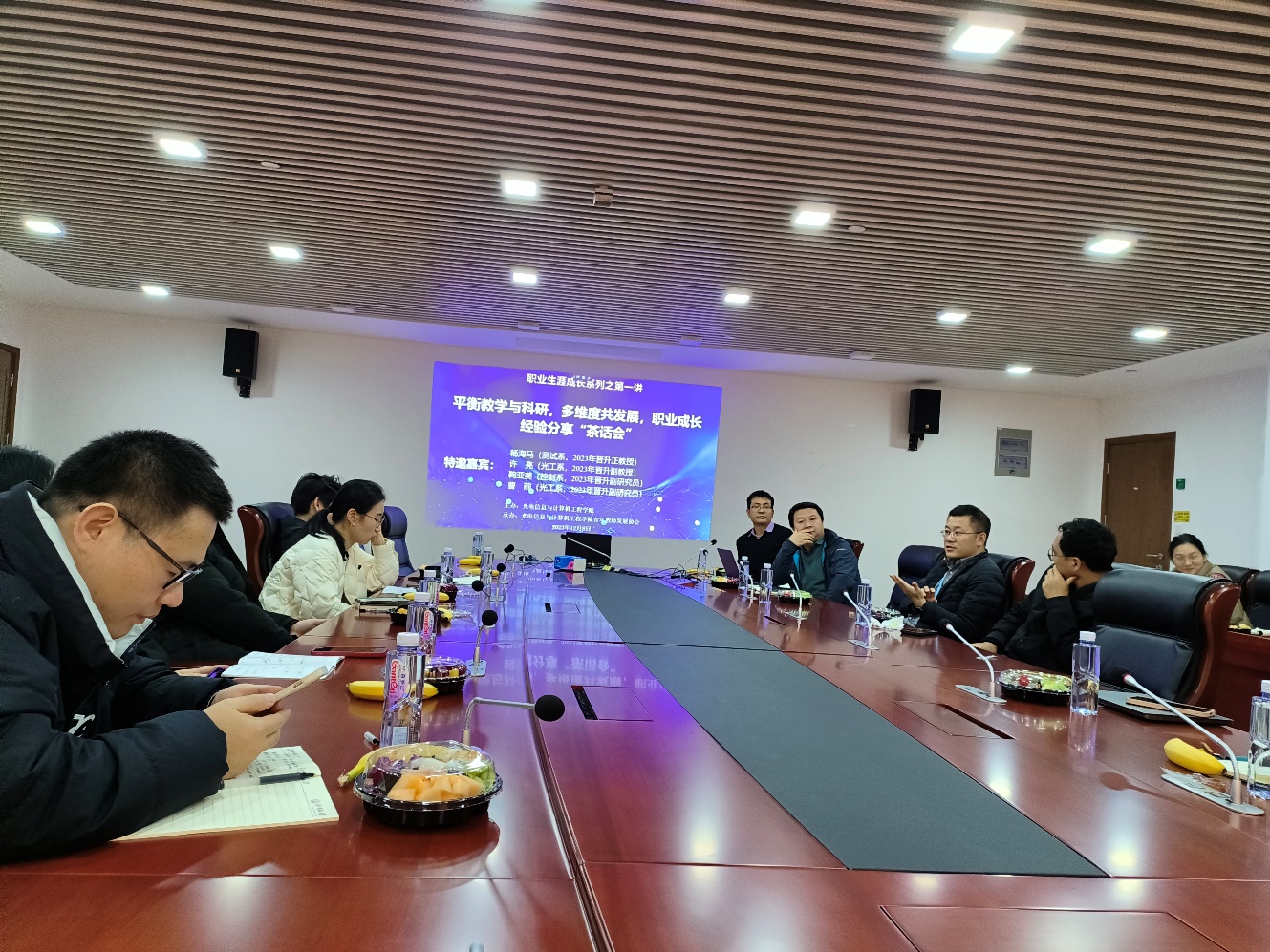 12月8日下午,在amjs澳金沙门欢迎您1042会议室,amjs澳金沙门欢迎您青年教师发展协会邀请本年度“不同序列”成功晋升职称的教师们与协会青年教师一起,举办了职业生涯成长系列“个人经验”分享与交流座谈茶话会活动。本次活动由amjs澳金沙门欢迎您主办、学院青年教师发展协会承办,会议主题明确而贴合青年教师们的实际需求,让参会青年教师能够在轻松自在的氛围内畅所欲言、“问”之有序、言之成理、尚理“成长”。副院长刘鹏参加茶话会,茶话会由协会会长禹德朝主持。