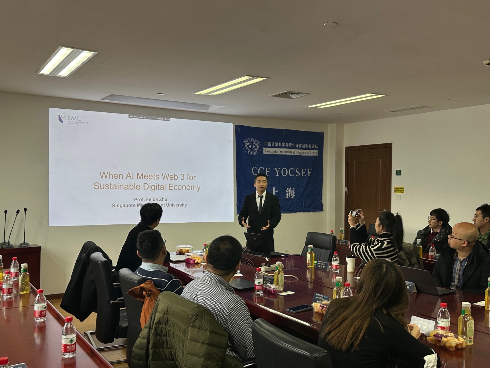 第一位演讲者是新加坡管理大学的朱飞达教授。朱飞达以《当AI遇上Web3:为可持续数字经济创新赋能》为题,发表了演讲。他全面剖析了当前数据治理、数据隐私保护等方面的挑战,从协同智能与通证化经济的视角,展望了未来的发展趋势和机遇。他还对新加坡管理大学与上海理工大学的深入合作提出了期待。演讲结束后,YOCSEF上海前主席裴颂文为其颁发感谢牌,以表彰其为本活动做出的贡献。