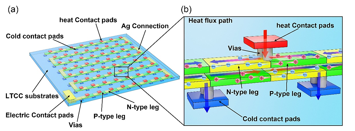 课题组研究了一种横向电流-纵向热导的同步转换机制,设计开发双层非接触式垂直热耦合横向热电结构,完成低温共烧陶瓷工艺的器件制备。形成以Ag和AgPd材料为热电偶单元的阵列组件,构建交错式分布的冷热源点阵。同时,研究团队在不同冷热源之间设计了空腔沟槽结构,其热损耗得到明显降低,从而提高温差发电器的驱动能力。所制备的横向温差发电器在单位面积输出电压和功率方面均得到显著提升。这种新型横向热电器件的研制为高性能热电转换器件的开发开辟新思路,成果得到了上海市白玉兰人才计划浦江项目(2023PJD066)的支持。