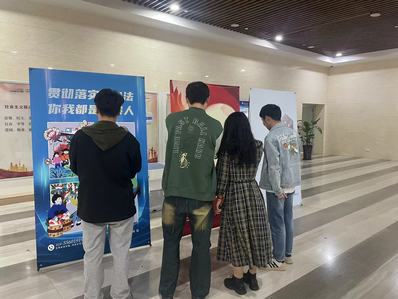 图2.师生们驻足观看宣传海报和宣传视频