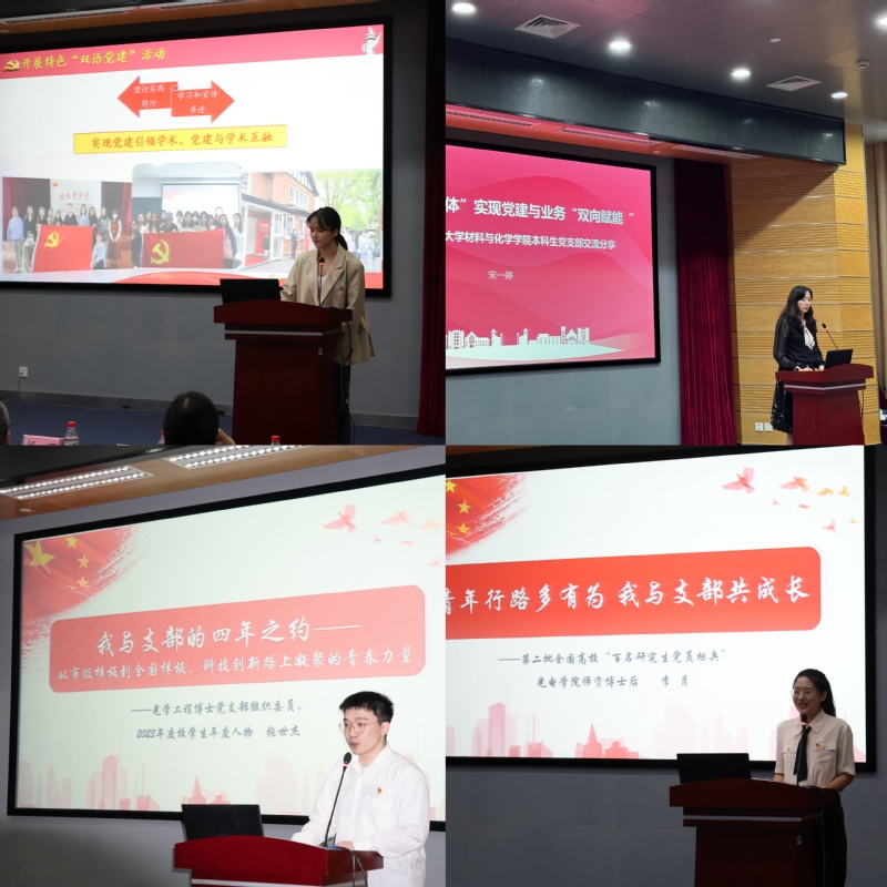交流中,第一批全国高校“百个研究生样板党支部”外语学院英语语言文学研究生党支部副书记施人文以《语言筑梦,党建领航》为题分享了支部“党建+专业”融合发展的建设品牌和“语言筑梦,传播中国声音、讲好中国故事”的建设愿景和目标。上海市高校“百个学生样板党支部”材料与化学学院本科生党支部书记宋一婷介绍了支部以打造“信仰共同体”、“价值共同体”、“专业共同体”和“成长共同体”实现党建和业务“双向赋能”,培养“立大志、明大德、成大才、担大任”的时代新人的建设模式。第三批全国高校“百个研究生样板党支部”光学工程(学硕)研究生党支部书记华昕怡从落实“七个有力”要求的角度介绍了支部在通过常态化、多形式开展党员教育、管理、监督、支部结对、典型宣传等方式实现高效学习、严明纪律规范、引领学术科研、发扬先锋作用等方面取得的积极成效以及新工科背景下打造科研型党支部的品牌建设思路与举措。第二批全国高校“百名研究生党员标兵”、上海市巾帼建功标兵、amjs澳金沙门欢迎您师资博士后李月以《青年行路多有为,我与支部共成长》为题从筑梦、追梦到圆梦三个阶段讲述了自己与支部共成长的心路历程与人生感悟,展现了新时代青年党员的追梦赤子心和“青年光子”的时代担当。amjs澳金沙门欢迎您博士生、2023年度校学生年度人物张世杰分享了他从申报上海市高校“百个研究生样板党支部”到第三批全国高校“百个研究生样板党支部”的难忘经历和经验总结。