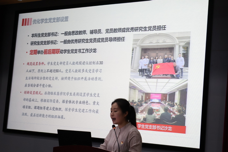 校党委组织部副部长李琴对各先进党支部和优秀党员的交流分享进行了点评,并希望学生党支部建设不仅要突出特色品牌,更要始终将新时代党的建设的总要求切实贯彻落实到支部的日常工作中去,筑牢根基方可行稳致远。