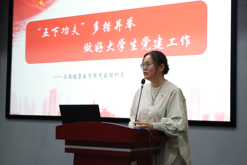 上海健康医学院党委组织员蒋瑛英带来了《“五下功夫”多措并举,做好大学生党建工作》的主题分享,她以学生从进校到成为正式党员为时间轴,讲述了学院党委通过领航教育、协同育人、榜样示范、盘活资源、发挥作用等针对不同阶段所采取的特色方法发现“好苗子”、培育“幼壮苗”、打造“后备军”、磨砺“生力军”、淬炼“主力军”的党员发展模式,有效提升了党员发展质量。上海交通大学医学院学生工作党委组织员刘超以《党建聚合力,让党旗高高飘扬》为主题介绍了具有学院特色的“探访式、互动式、启发式、沉浸式、体验式”五步学习法和学院党委在有效推动党支部建设的规范化、系统化、制度化、专业化、扁平化、透明化、高效化等方面进行的有益探索。