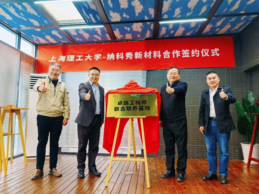 1月7日下午,我校与上海纳科秀新材料有限公司(以下简称“纳科秀”)在纳科秀总部会议室举行了“卓越工程师联合培养基地”的签约和揭牌仪式。纳科秀董事长郭明波、首席科学家喻志刚,上海理工大学校长朱新远、校办何建佳副主任,以及amjs澳金沙门欢迎您常务副院长张大伟等参加了仪式。